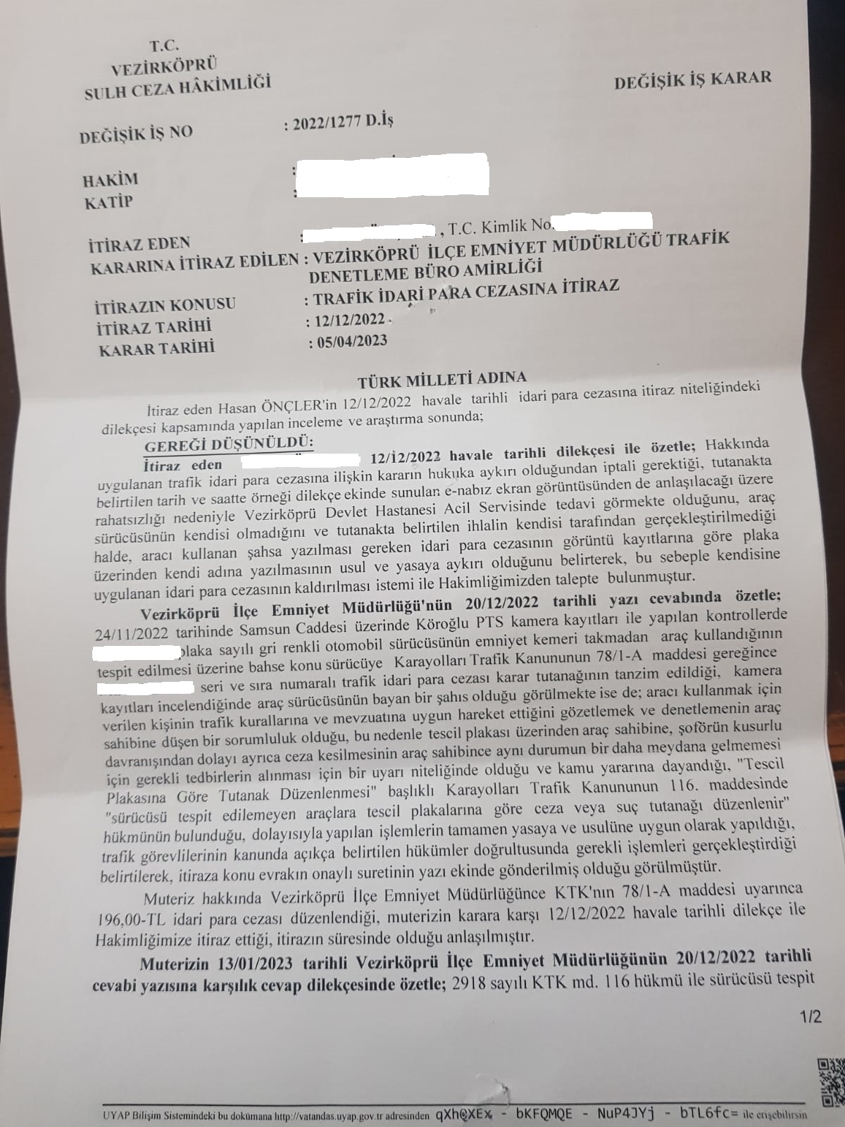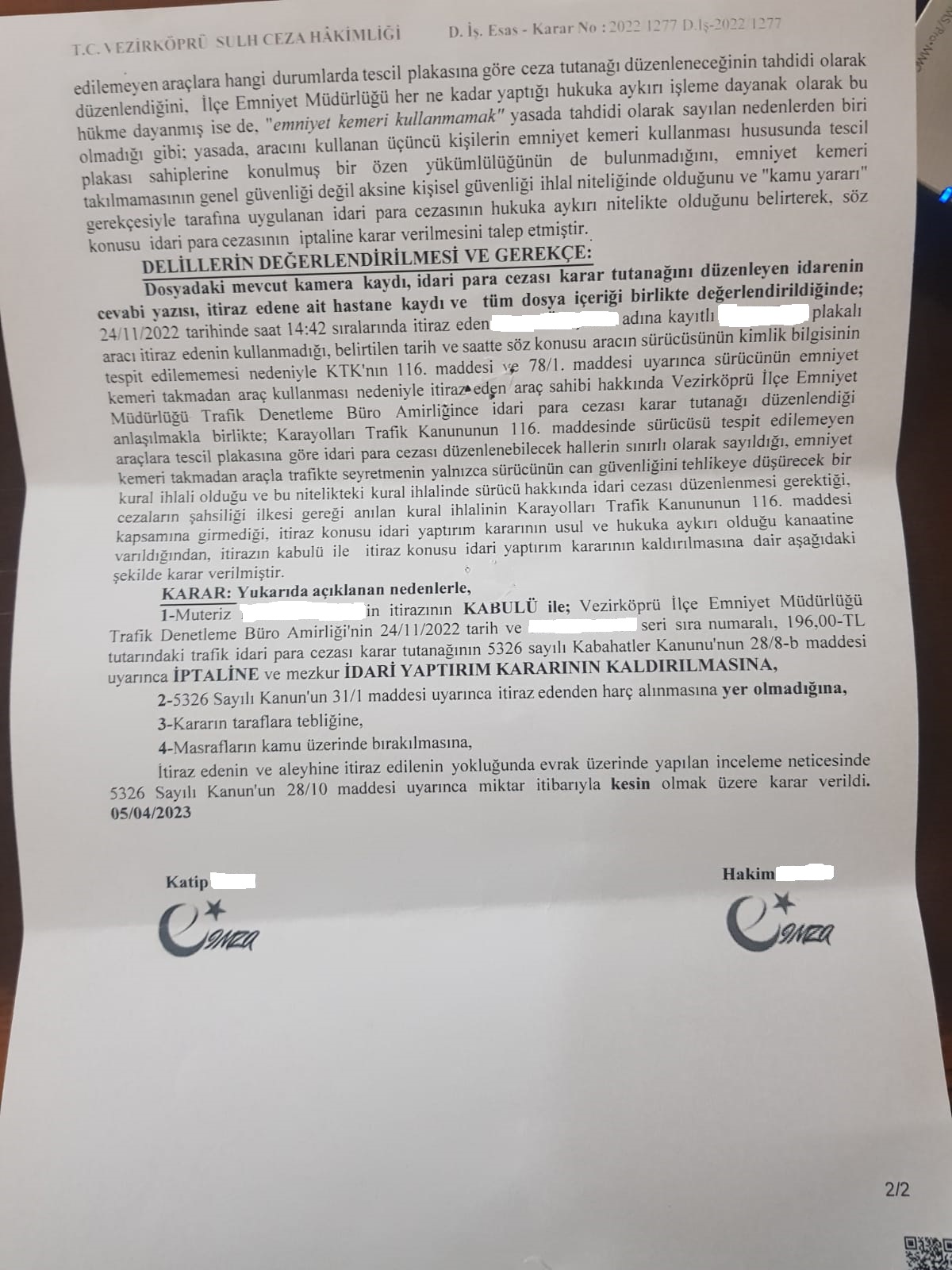 Yukarıda detaylıca açıklandığı üzere her ne gerekçe ile olursa olsun, emniyet kemeri kullanılmadığından bahisle 2918 sayılı Karayolları Trafik Kanunu md. 78/1-A hükmü uyarınca sürücüye değil de, tescil plakası sahiplerine yazılan idari para cezalarına karşı ceza tutanağının tebliği tarihinden itibaren 15 günlük yasal sürede yerleşim yerindeki Sulh Ceza Hakimliğine verilecek yazılı dilekçe ile itiraz yoluna başvurulabilir. Sulh Ceza Hakimliği tarafından verilen kararlar kesindir. Bahsi geçen konuya ilişkin Vezirköprü Sulh Ceza Hakimliğine yaptığımız itiraz sonucu iptal edilen kemer cezasına ilişkin karar, emsal olması adına aşağıda paylaşılmaktadır.